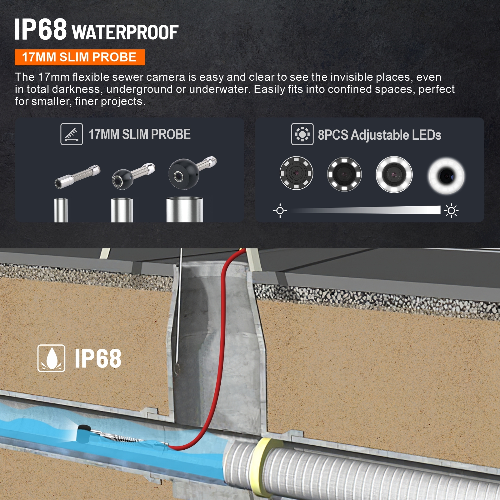 【EASILY FITS INTO SMALLER SPACE】- The 17mm slim camera probe with flexible spring is designed for smaller space, instead of 23mm/45mm like many drain pipe cameras in the market today. The cable is made of fiberglass and the semi-rigid design brings you a good operation experience while pushing the endoscope into the pipelines. The snake camera with light is suitable for straight pipes at 20mm (0.79 inch), bend pipes at 40mm (1.5 inches), nearly 90° bend pipes at 127mm (5 inches).